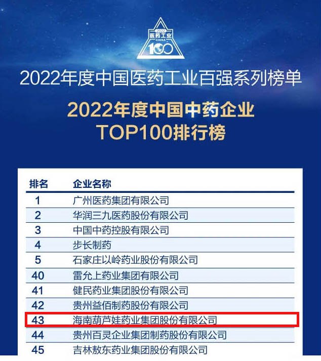 会议期间,一年一度的中国医药工业百强系列榜单隆重揭晓,凯时登录药业集团凭借领先的研发优势和扎实的生产实力以及稳健的市场推广能力,连续第四年成功入选“2022年度中国中药企业TOP100排行榜” ,排名稳步上升至第43位。